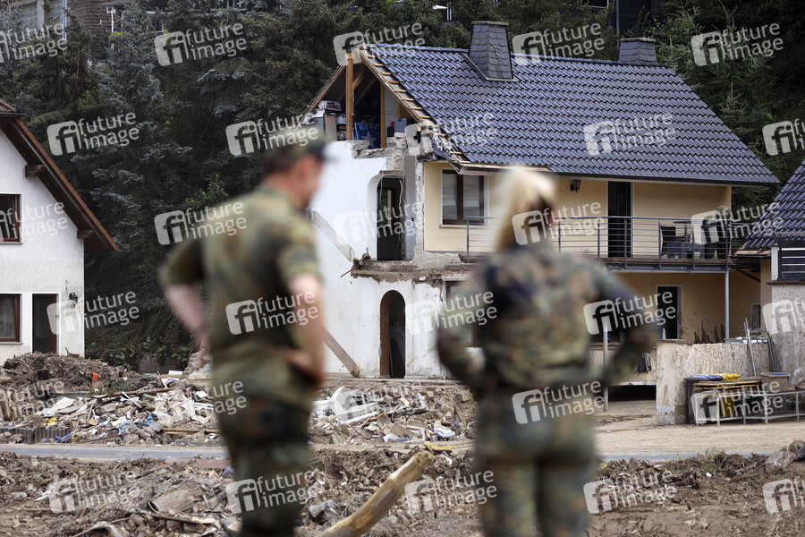 Nach dem Jahrhunderthochwasser in der Eifel durch heftige Regenfälle und Dauerregen mit Überschwemmungen und Überflutungen haben die Aufräumarbeiten im Ahrtal große Fortschritte gemacht. Einheiten von Polizei, THW, Bundeswehr und Feuerwehr mitsamt vielen freiwilligen Helfern haben Straßen geräumt, Schutt und Schlamm entfernt und die Menschen versorgt. Der Wiederaufbau wird trotzdem Jahre dauern. Im Bild Soldaten und Flutschäden in der Ortschaft Dernau, in der die Flut viele Häuser zerstörte, 30.07.2021