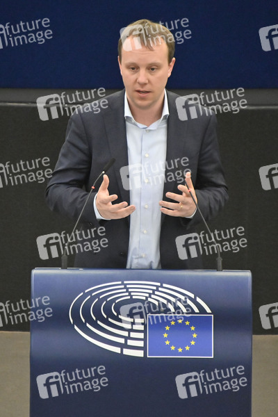 Daniel Freund bei einer Plenartagung zur Zusammenarbeit und Gemeinsamkeiten des Putin-Regimes und rechtsextremer sowie separatistischer Bewegungen in Europa im Plenarsaal des Europäischen Parlaments. Straßburg, 06.04.2022