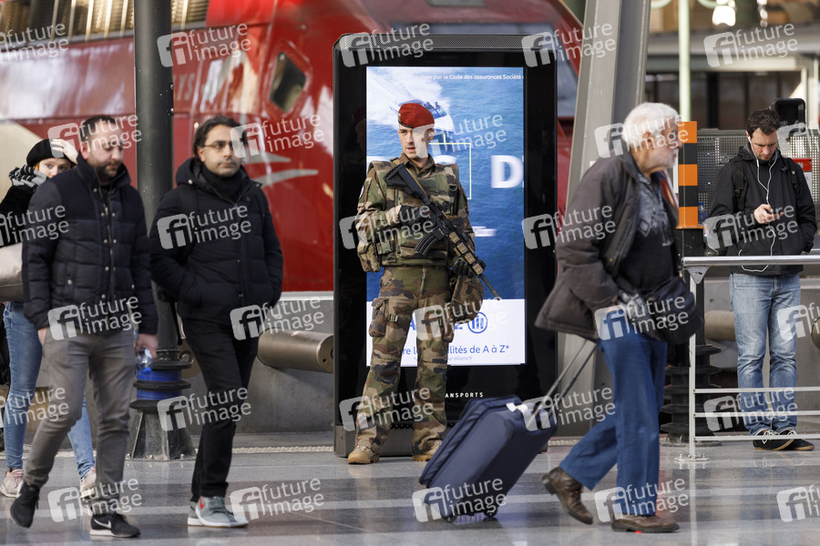 Soldaten bewachen während der Gelbwesten-Proteste auf Geheiß von Präsident Macron öffentliche Gebäude. Im Bild Soldaten am Bahnhof Gare du Nord. Paris, 23.03.2019