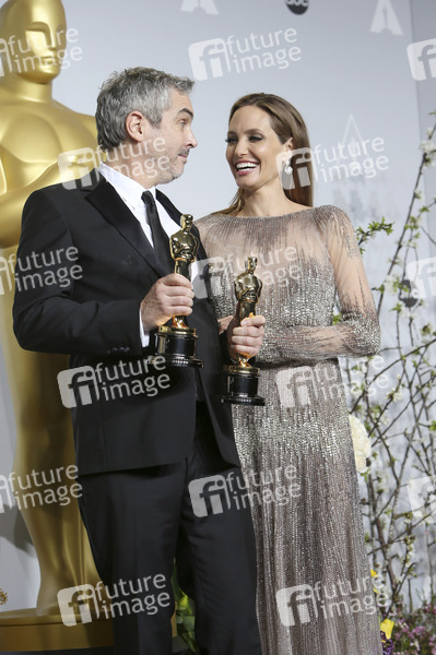 Alfonso Cuaron mit Oscars für die beste Regie und den besten Schnitt bei 'Gravity' und Angelina Jolie bei der Oscar Verleihung 2014 / 86th Academy Awards Preisverleihung im Dolby Theatre, Hollywood. Los Angeles, 02.03.2014