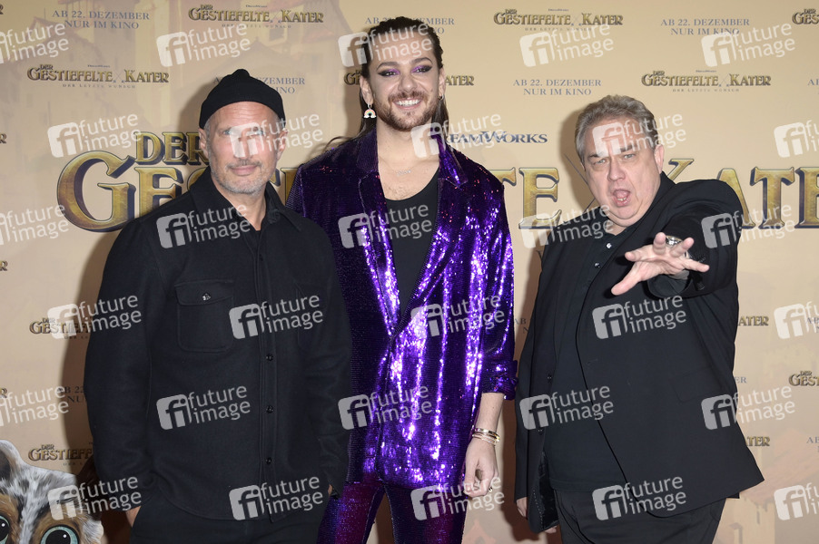 Benno Fürmann, Riccardo Simonetti und Oliver Kalkofe bei der Premiere des Kinofilms 'Der gestiefelte Kater: Der letzte Wunsch / Puss in Boots: The Last Wish' im Kino in der KulturBrauerei. Berlin, 11.12.2022