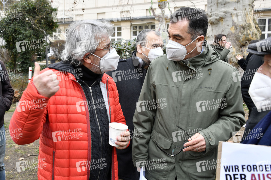 Can Dündar und Cem Özdemir bei der Pressekonferenz des KulturForum TürkeiDeutschland zur Solidarität mit den gesamten demokratischen Kräften in der Türkei, insbesondere mit inhaftierten Schriftsteller*innen, Künstler*innen, Journalist*innen, Gewerkschafter*innen und Politiker*innen vor dem Maxim Gorki Theater. Berlin, 23.03.2021