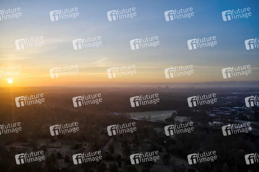Luftbild Sonne (Aufgang 6:51 Uhr) und Mond (Aufgang 4:51 Uhr) treffen am Himmel zusammen. Hannover, 08.03.2021