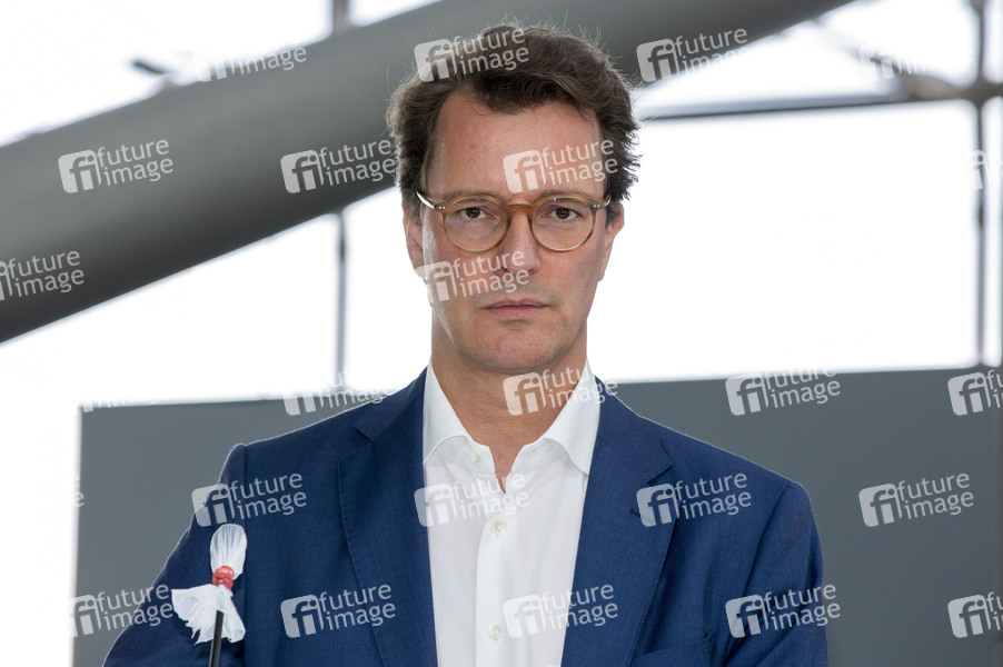 Hendrik Wüst bei der Vorstellung einer technischen Machbarkeitsstudie zum Einsatz bemannter Flugtaxen am Köln Bonn Airport. Köln, 22.07.2020
