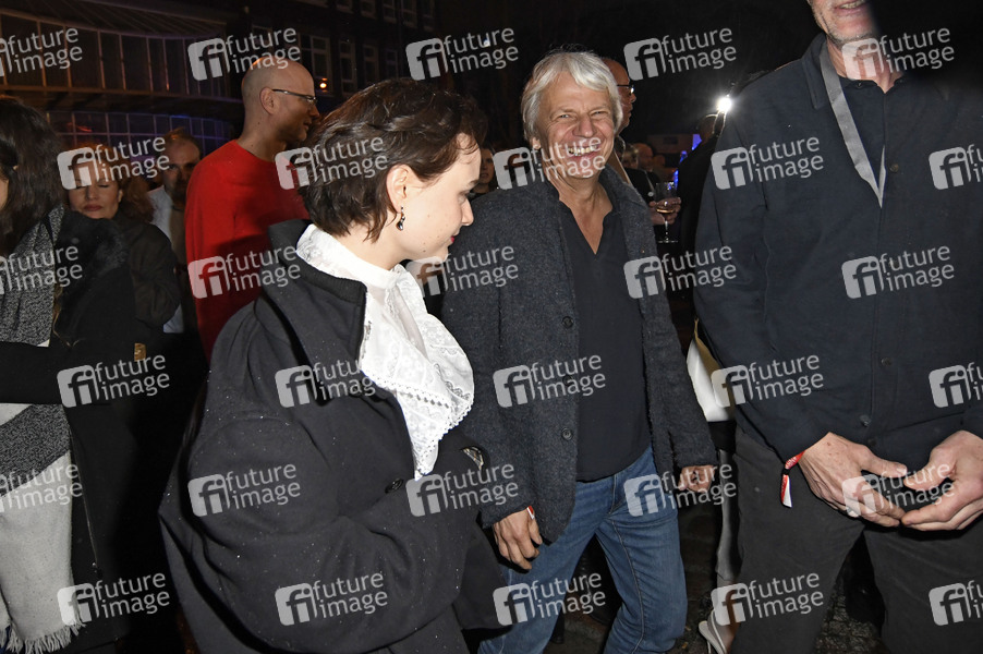 Lena Urzendowski und Andreas Dresen nach dem Feueralarm beim 21. NRW Empfang des Landes NRW und der Film- und Medienstiftung NRW im Rahmen der Berlinale 2024 in der Vertretung des Landes Nordrhein-Westfalen. Berlin, 18.02.2024