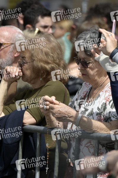 Trauernde Menschen nach dem Tod von Papst Franziskus auf dem Petersplatz. Rom, 21.04.2025