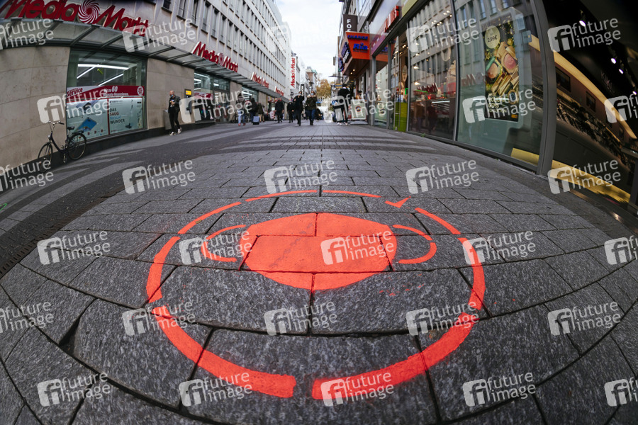 Köln ist weiter Corona-Risikogebiet: In der Hohe Straße werden Passanten durch große gesprayte Piktogramme auf die dort geltenden Corona-Regeln zu Maskenpflicht und Mindestabstand hingewiesen. Köln, 09.11.2020