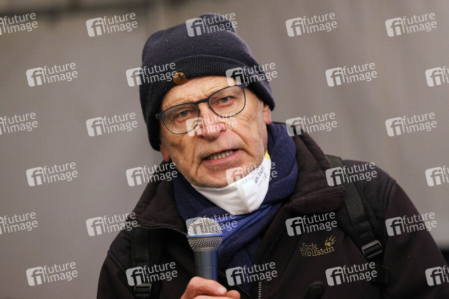 Günter Wallraff bei der Solidaritätsaktion mit Obdachlosen am Kölner Hauptbahnhof. Die Vereine 'Helping Hands' und die Sozialistische Selbsthilfe Mülheim (SSM) haben unterstützt von der Initiative 'Arsch Huh' am Wochenende dazu eingeladen, in einer Solidaritätsaktion drei Nächte am Hauptbahnhof zu übernachten. Köln, 03.12.2021