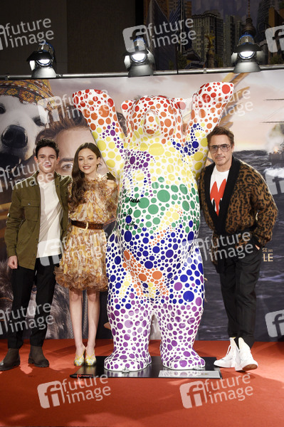 Harry Collet, Carmel Laniado und Robert Downey Jr. beim Signieren eines Buddy Bären während der Pressekonferenz zum Kinofilm 'Die fantastische Reise des Dr. Dolittle' im Waldorf Astoria Hotel. Berlin, 20.01.2020