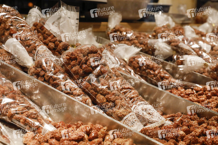 Weihnachtsbude Gebrannte Mandeln - Jedes Jahr verwandelt sich die Bonner Innenstadt in eine stimmungsvolle Budenstadt, dem Bonner Weihnachtsmarkt. Kunsthandwerk, Fahrgeschäfte und viele kulinarische Köstlichkeiten machen den Besuch bei gemütlicher Atmosphäre zu einem kleinen Erlebnis. Energiesparmaßnahmen finden sich in der LED-Technik, im begrenzten Zeitraum der Beleuchtungen nur zwischen 16 und 22:00 Uhr sowie beim Verzicht auf Heizpilze. Bonn, 03.12.2022