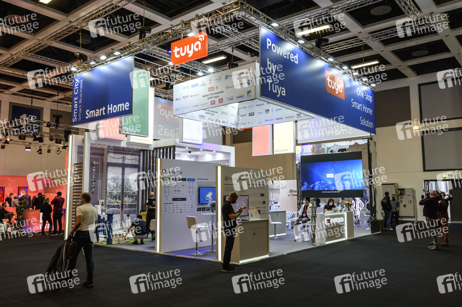 Messestand von Tuya - Eröffnung der Internationalen Funkausstellung 2020 unter dem Motto 'IFA 2020 Special Edition: Tech-Branche meldet sich zurück'. Es ist die erste Messe unter Corona-Bedingungen, die zum Teil online stattfindet. Es gibt nur etwa 250 Aussteller in den Messehallen. Die Messe ist nur für Fachpublikum unter strengen Hygienauflagen zugänglich.. Berlin, 03.09.2020