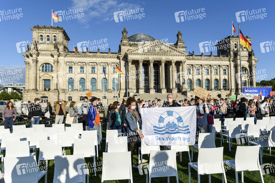 Unter dem Motto 'Wir haben Platz' stehen 13000 leere Stühle vor dem Berliner Reichstag. Mit die Aktion fordern unter anderem die Aktion Seebrücke und CAMPACT die Evakuierung griechischer Flüchtinglager und die Aufnahme von Geflüchteten. Die Stühle stehen stellvertretend für die 13000 Flüchtlinge im Flüchtingslager Moria. Berlin, 07.09.2020