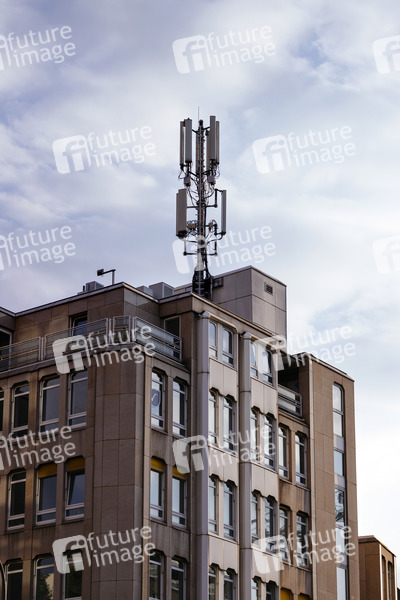 Eine Mobilfunkantennen auf einem Hausdach am Friesenplatz, welche nach populären Corona-Verschwörungstheorien für das Sterben von Vögeln und Menschen im Rahmen von 5G verantwortlich sein sollen. Köln, 20.05.2020