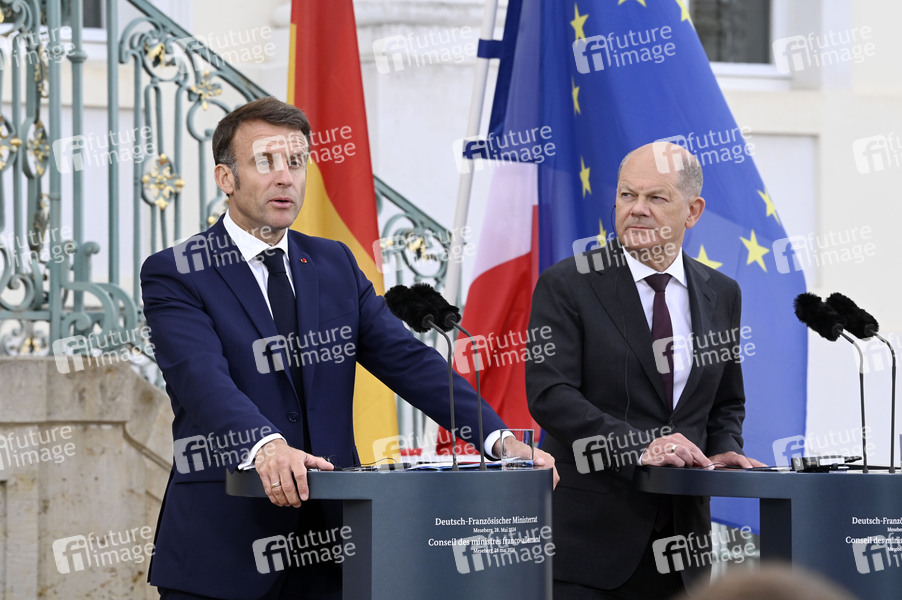 Emmanuel Macron und Olaf Scholz beim Treffen des Deutsch-Französischen Ministerrats im Gästehaus der Bundesregierung Schloss Meseberg. Meseberg, 28.05.2024