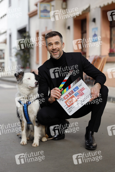 Jo Weil mit seinem Hund Sky beim Fototermin am Set der RTL TV-Serie 'Unter uns' in den MMC-Studios in Ossendorf. Köln, 01.03.2022