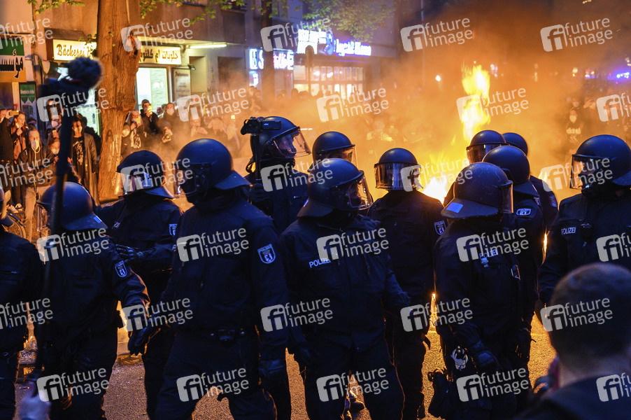 Linke und linksradikale Gruppen protestieren am Tag der Arbeit mit der Revolutionären 1. Mai-Demonstration unter dem Motto 'Yallah Klassenkampf - Auf zum revolutionären 1. Mai!' in Berlin. Am Rande der Demonstration kommt es zu Auseinandersetzungen mit der Polizei. Berlin, 01.05.2021