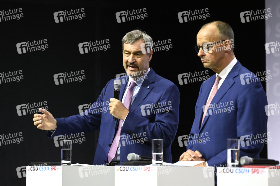 Markus Söder und Friedrich Merz bei der Unterzeichnung des Koalitionsvertrages zwischen CDU, CSU und SPD im Gasometer Schöneberg. Berlin, 05.05.2025