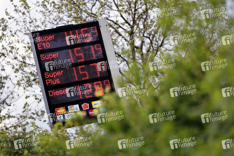Benzinpreis-Anzeige an einer Tankstelle von Mundorf Tank. Durch die dritte CO2-Steuer für Autofahrer ist das Tanken in Deutschland 2021 noch teurer. Die Grünen haben bereits angekündigt, die Spritpreise nach erfolgreicher Wahl 2021 noch weiter zu erhöhen. (Themenbild, Symbolbild) Troisdorf, 18.05.2021