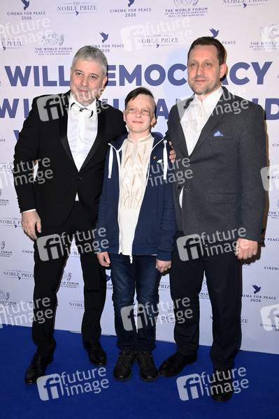 Evgeny Afineevsky / Jewgeni Afinejewski, Roman Oleksiv und Bob Geldof bei der Cinema For Peace Gala 2026 im Hotel Adlon Kempinski. Berlin, 16.02.2026