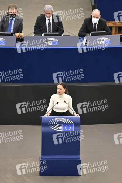 Sira Rego bei der Präsidentschaftskandidaten-Präsentation im Plenarsaal des Europäischen Parlaments. Straßburg, 18.01.2022
