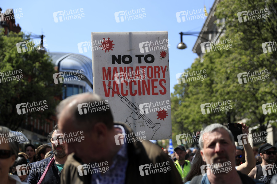 Mehrere tausend Menschen protestieren gegen die Corona-Maßnahmen und ziehen trotz geltender Beschränkungen für Massenversammlungen durch die britische Hauptstadt. Masken trägt dabei so gut wie niemand, dafür aber Protestschilder mit Aufschriften, die sich unter anderem gegen Corona-Pässe und -Tests richteten. London, 24.04.2021