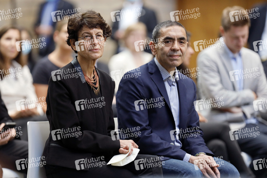 Özlem Türeci und Ugur Sahin, die Gründer des Biotechnologie-Unternehmens Biontech, bei der Verleihung der Ehrendoktorwürde der Medizinischen Fakultät der Uni Köln und der Eintragung ins Goldene Buch der Stadt Köln. Köln, 17.09.2021
