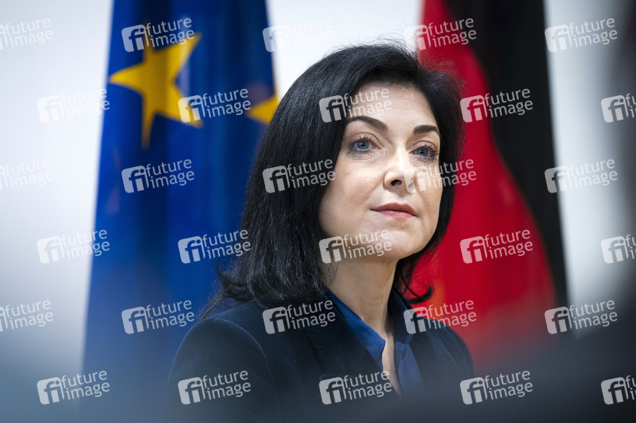 Katherina Reiche beim gemeinsamen Pressestatement der Bundesministerin für Wirtschaft und Energie und der Exekutiv-Vizepräsidentin der EU Kommission im Bundesministerium für Wirtschaft und Energie. Berlin, 19.05.2025