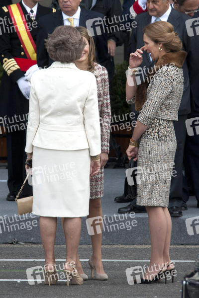 Die spanische Königsfamilie bei der Hommage an die Nationalflagge mit Militärparade am Palacio Real, Madrid