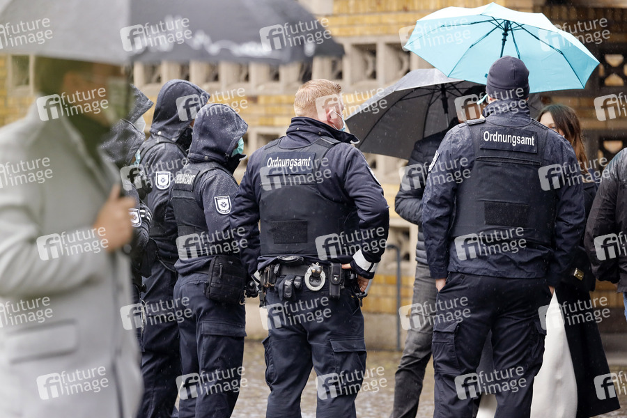 Ordnungsamt-Mitarbeiter bei der Trauerfeier und Beerdigung von Willi Herren auf dem Melaten Friedhof. Köln, 05.05.2021