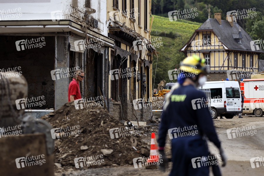 Nach dem Jahrhunderthochwasser in der Eifel durch heftige Regenfälle und Dauerregen mit Überschwemmungen und Überflutungen haben die Aufräumarbeiten im Ahrtal große Fortschritte gemacht. Einheiten von Polizei, THW, Bundeswehr und Feuerwehr mitsamt vielen freiwilligen Helfern haben Straßen geräumt, Schutt und Schlamm entfernt und die Menschen versorgt. Der Wiederaufbau wird trotzdem Jahre dauern. Im Bild Flutschäden in der Ortschaft Mayschoß, in der die Flut viele Häuser zerstörte, 08.08.2021