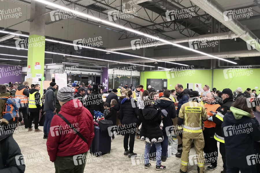 Ein Erstaufnahmelager für ukrainische Flüchtlinge in Korczowa nahe des Grenzübergang Korczowa-Krakowiec (Polen-Ukraine) in einem Einkaufszentrum. Korczowa, 09.03.2022