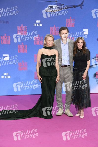 Pamela Anderson, Liam Neeson und Erica Huggins bei der Premiere des Kinofilms 'Die nackte Kanone / The Naked Gun' im Kino UCI Luxe East Side Gallery. Berlin, 24.07.2025
