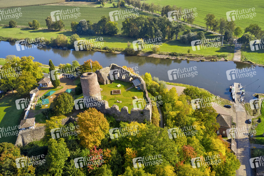 Eversteiner Burg, Sehenswürdigkeit an der Weser, Ruine, Höhenburg, Luftaufnahme, Tourismus, erste Erwähnung 1285