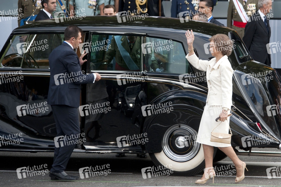 Die spanische Königsfamilie bei der Hommage an die Nationalflagge mit Militärparade am Palacio Real, Madrid