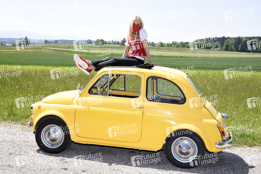 Isabella Hübner beim Fototermin beim Fototermin mit einem Fiat 500 Oldtimer und Angelika Zwerenz Masken und Tracht. Deining, 17.05.2020