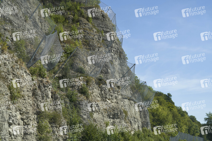 Sicherheit, Schutz bei Extremwetterlagen, Steinschlag, Sicherung, Geröll, Gestein, Steine, Felsen, Straße, Hangbefestigung, Böschungssciherung, Steinschlagsicherung, Gelände, Sicherungszäune, Symbolfoto, Symbolbild