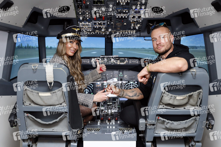 Cora Schumacher und Eric Sindermann bei einem Fototermin im Boeing 737 Flugsimulator der AerotaskGmbH in der Motorworld Köln. Köln, 27.10.2021