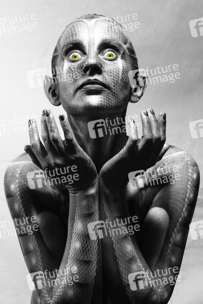 Bodypainting, Erotik, Frau, nackt, drinnen, weiblich, Monster, Außerirdische, Alien, Echse, Körperkunst, Kunst, Malerei, monochrom, erotic, woman, nude, indoor, female, monochrome, lizard, body art, body painting