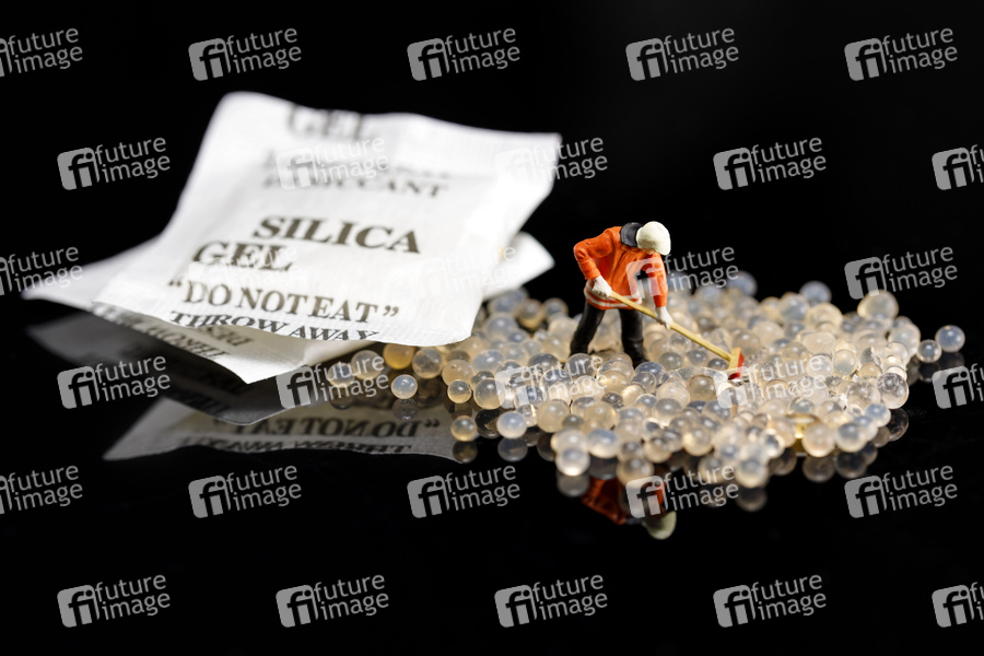 Der Inhalt eines Dry-Pack mit Silica Gel wird von einer Miniaturfigur zusammengekehrt. (Themenbild, Symbolbild)