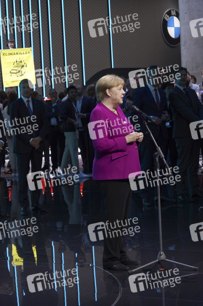 Angela Merkel beim Abschlussstatement am Messestand von BMW beim Eröffnungsrundgang auf der Internationalen Automobil-Ausstellung 2019 auf dem Messegelände. Frankfurt am Main, 12.09.2019