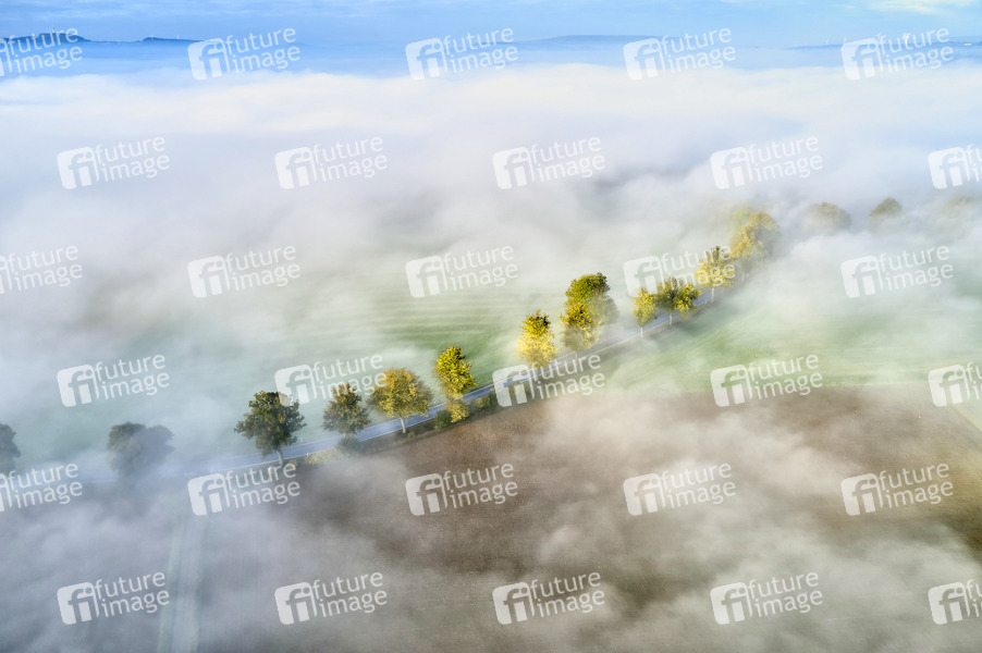 Morgennebel, Nebel, Hochnebel, vernebelt, Sichtweite, Wettervorhersage, eingeschränkte Sicht, diesig, schlechte Sicht, Sichtbehinderung, Wetter, Verkehr, Unfallgefahr, Kondensation, Luftaufnahme, Luftbild, Drohne, Drohnenaufnahme, Symbolbild, Symbolfoto