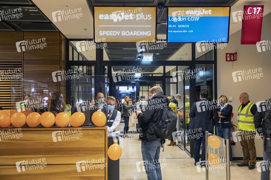 Allererster kommerzieller Abflug vom BER mit easyJet nach London Gatwick am Gate im Non-Schengen-Bereich des Terminal 1 im Flughafen Berlin Brandenburg. Schönefeld, 01.11.2020