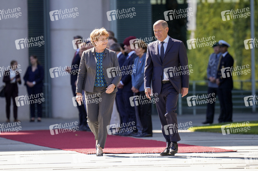 Viola Amherd und Olaf Scholz beim Empfang der Bundespräsidentin der Schweiz mit militärischen Ehren und zu einem gemeinsamen Gespräch mit anschließendem Pressestatement im Bundeskanzleramt. Berlin, 15.05.2024