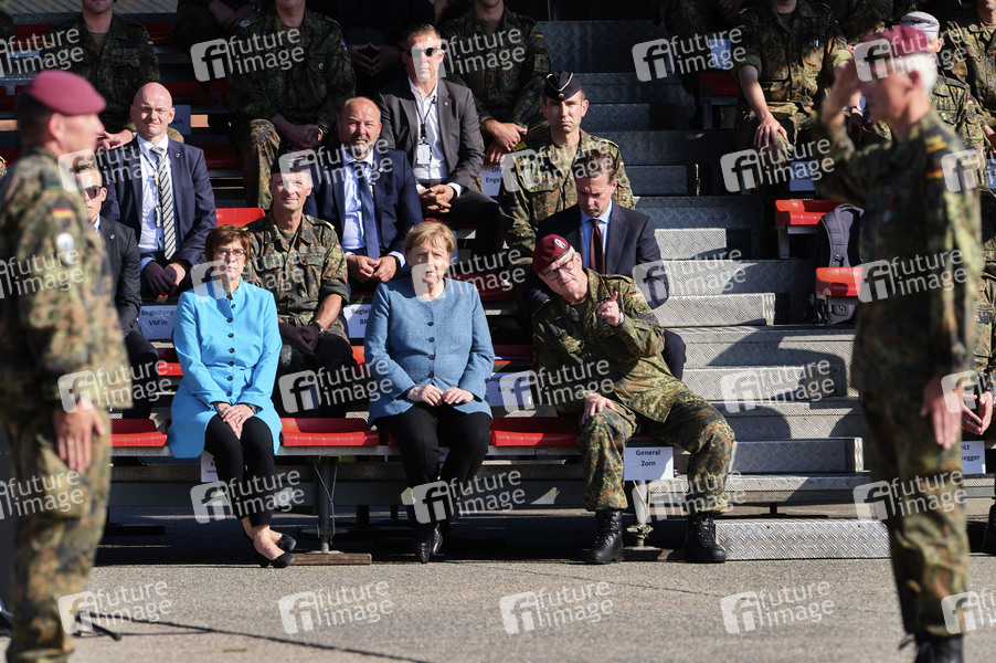 Verteidigungsministerin Annegret Kramp-Karrenbauer, Bundeskanzlerin Angela Merkel und General Eberhard Zorn bei einem Appell für die Soldatinnen und Soldaten der Evakuierungsmission in Kabul und dem Feierlichen Gelöbnis von Rekruten des Fallschirmjägerregiments 31 in der Fallschirmjägerkaserne Seedorf. Seedorf, 22.09.2021
