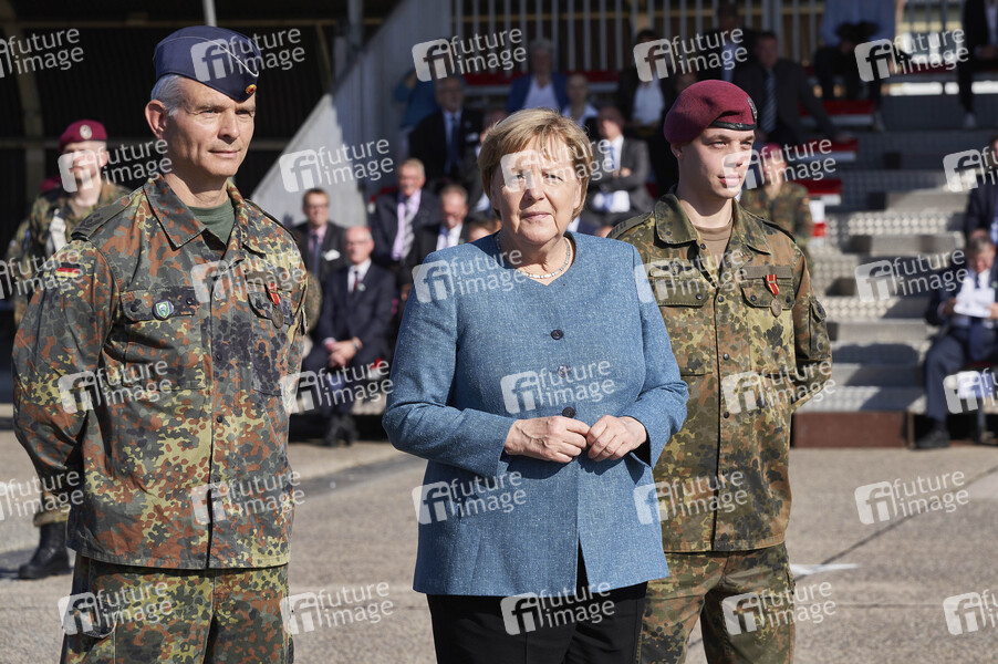 Bundeskanzlerin Angela Merkel bei einem Appell für die Soldatinnen und Soldaten der Evakuierungsmission in Kabul und dem Feierlichen Gelöbnis von Rekruten des Fallschirmjägerregiments 31 in der Fallschirmjägerkaserne Seedorf. Seedorf, 22.09.2021