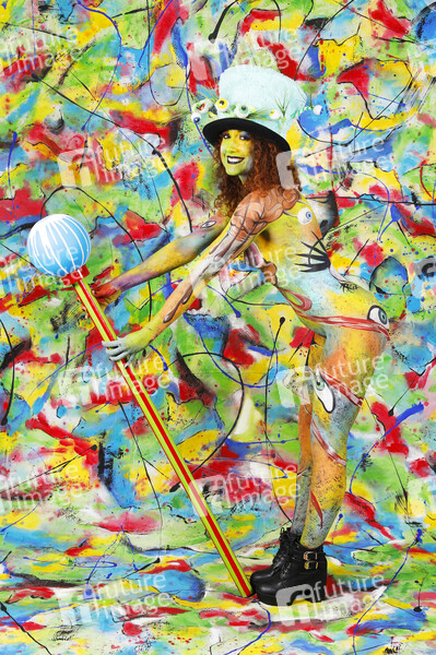 Das World Bodypaiting Festival 2020 fand aufgrund der Corona-Pandemie online statt. Unter dem vorgegebenen Motto 'Psychedelic Circus' verwandelte BodyArt-Künstler Jörg Düsterwald sein Model Lena in einen psychedelischen Mad Hatter. Hameln, 10.07.2020