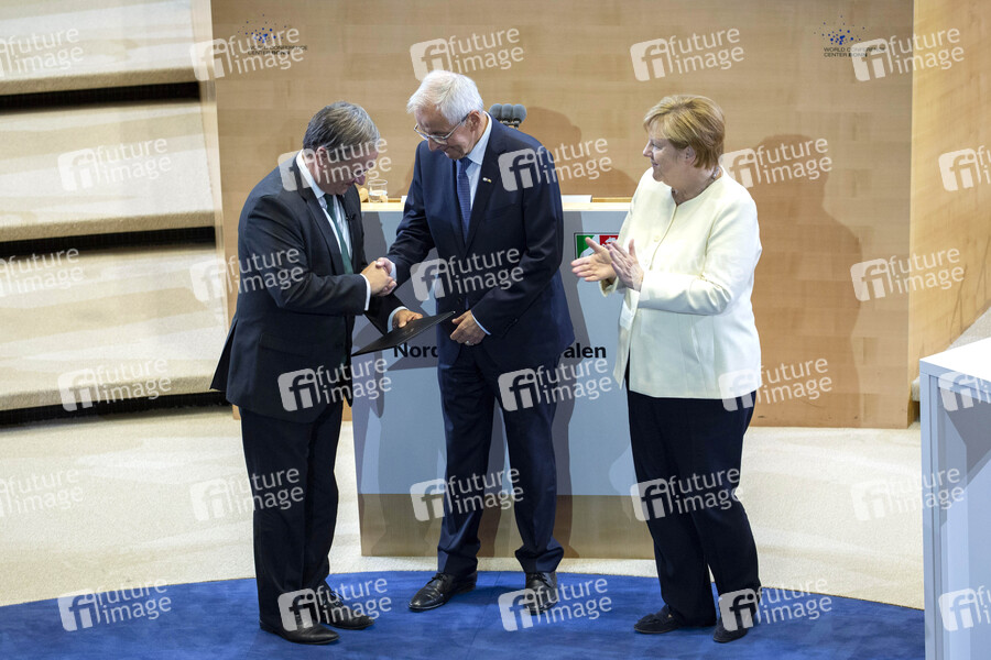 Armin Laschet, Klaus Töpfer und Angela Merkel bei der Verleihung des Staatspreises des Landes Nordrhein-Westfalen 2019 an Klaus Töpfer im WCCB. Bonn, 16.09.2019