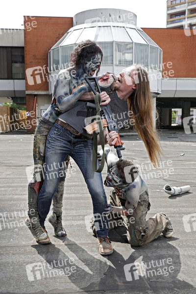 GEEK ART - Bodypainting and Transformaking: Zombie-Apokalypse Photoshooting mit den Barbara R. und Paul Skupin als Zombies und Collin R. als Opfer im Ihme-Zentrum in Hannover. - Ein Projekt des Fotografen Tschiponnique Skupin und des Bodypainters und Transformakers Enrico Lein