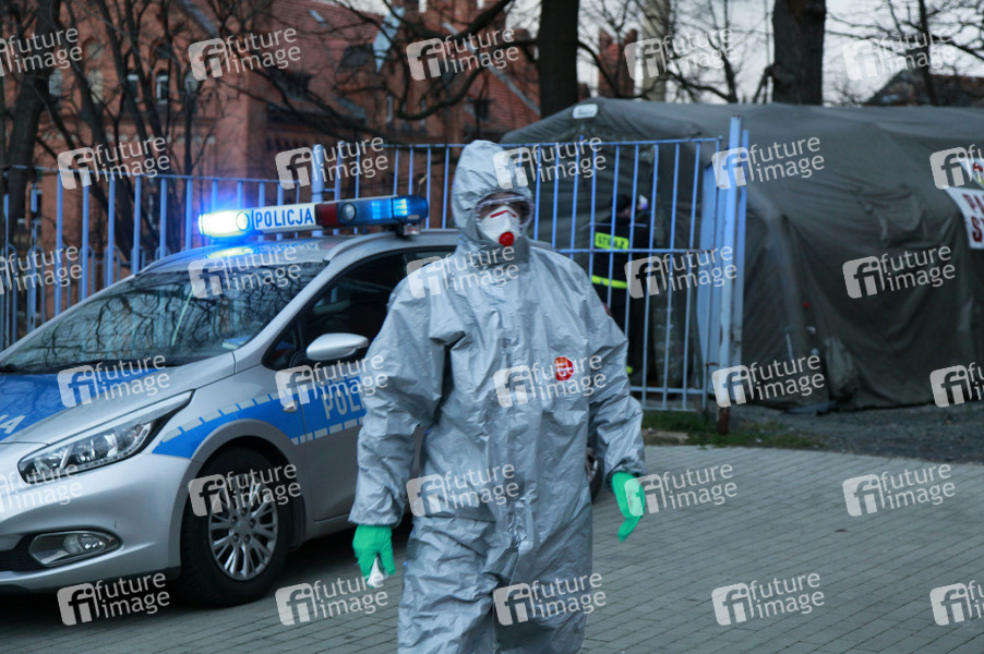Polnische Spezialkräfte führen am Grenzübergang Stadtbrücke zwischen Görlitz und Zgorzelec Kontrollen auf eine mögliche Coronavirus-Infektion durch. Görlitz, 13.03.2020