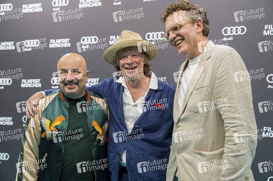 Sandro Giampietro, Helge Schneider und Christoph Gröner bei der Premiere des Dokumentarfilms 'The Klimperclown' auf dem 42. Filmfest München 2025 inm Deutschen Theater. München, 30.06.2025